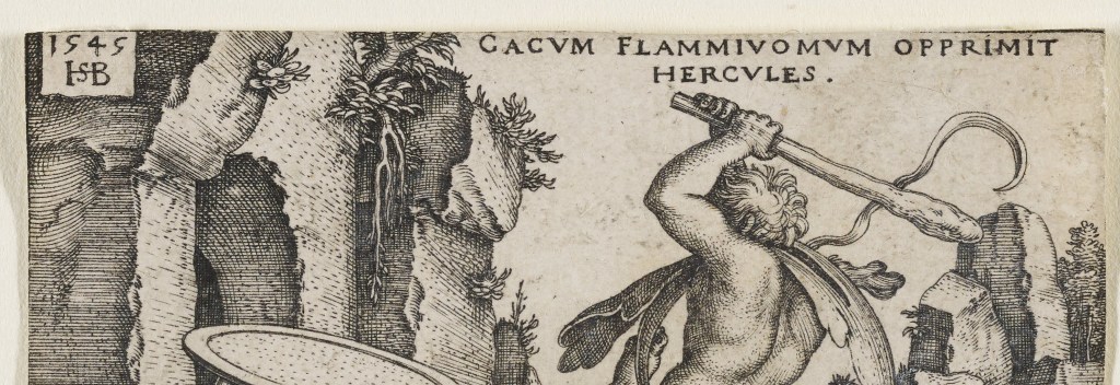 Hercules was highly regarded in other corners of the ancient Mediterranean too, not least the Italian peninsula in which the city of Rome was just a small part. Hercules’ travels around Italy are well documented by Virgil in the Aeneid, in particular Book 8, where King Evander recounts to Aeneas and his fellow Trojans, the time when Hercules, once again in the company of Geryon’s cattle, rid Evander’s kingdom of the fire breathing giant Cacus. In response to this deed, again an act of violence required to produce unity, Evander erected an altar to Hercules in the Forum Boarium (site of cattle trading) in Rome. To drive the point home, Evander completes his account of Cacus’ death by asking his listeners to raise a toast to the god who is “the god we all share” – Hercules, the deity who encourages integration and social stability. The parallels between Hercules and Augustus, as the latter strove to create his Pax Romana after vicious civil war could not be more obvious.