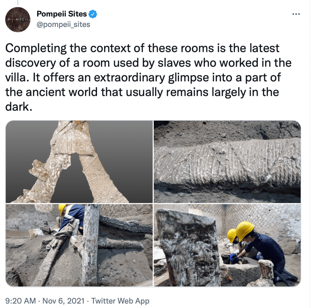 This room is an important discovery in many ways, particularly as a demonstration of what more ordinary furnishings were like, as opposed to the lavish bronze and wooden furniture that is familiar from Herculaneum. This new furniture from Pompeii was recovered by the technique of making plaster casts pioneered by the 19th century archaeologist Giuseppe Fiorelli. These are made by drilling down to the cavity and pouring in plaster, creating a perfect impression of the original object, which can then be excavated without damage. Dr Zuchtriegel’s team have further developed this technique and now use dental plaster, which preserves things like the furniture in extraordinary detail. He described the feeling of pouring the plaster into a cavity, not knowing whether it would produce a fantastic find or if they were pouring unlimited amounts of expensive dental plaster into an animal burrow! Luckily, this particular dig did produce some fantastic finds. The bedframes found in the slaves’ quarters were covered with hammock-like rope windings instead of mattresses. The plaster preserves the details of the tiniest of fibres. It is a rare and moving connection to the ancient world to see in such detail the lives of people with limited visibility in both literary and archaeological sources.