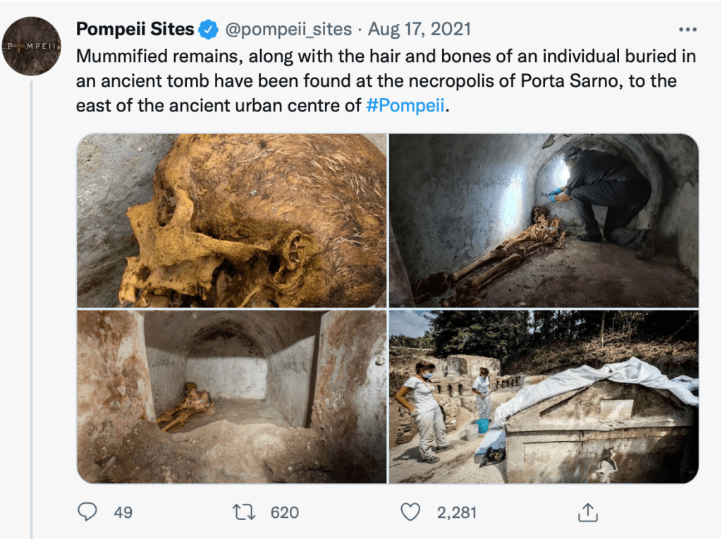It is not certain why Venerius chose to be buried rather than cremated. Other amphorae containing ashes were found in the tomb, most likely containing the remains of members of his family. However, Dr Zuchtriegel touched on an intriguing possible explanation here: Nero’s visit to Pompeii. In around the year 64CE, Nero and his then wife Poppaea visited Pompeii and specifically the temple of Venus, the city’s patron deity. Venerius’ tomb specifies that he was a guardian of the temple, and may have joined other local bigwigs for the occasion. Whatever actually happened during Nero’s visit, the freedman would have been very excited and may have wanted to emulate Nero and Poppaea in certain respects. Just as he sponsored Greek performances in life, his inhumation may have been inspired by that of Poppaea, whose body was embalmed and placed in the Mausoleum of Augustus in the year 65CE. Perhaps Venerius’ final wish was to carry on forging his identity as a Roman citizen by copying the imperial family, even in death.