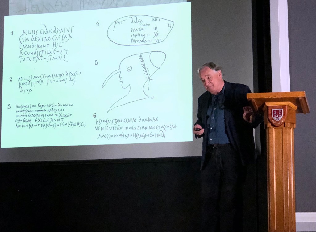 Professor Wallace-Hadrill presented prizes to students in the AKS Creative Classics Competition before delivering his lecture Winning Freedom in Pompeii and Herculaneum where he chose not to use the traditional pointer to highlight his slides but a full sized pilum! Andrew is a wonderful speaker and his knowledge limitless. His wide ranging talk covered a range of evidence, including archaeology and epigraphic inscriptions, which helps historians to uncover the lives of enslaved people in the ancient world – where they came from, how they lived and how they might gain their freedom.