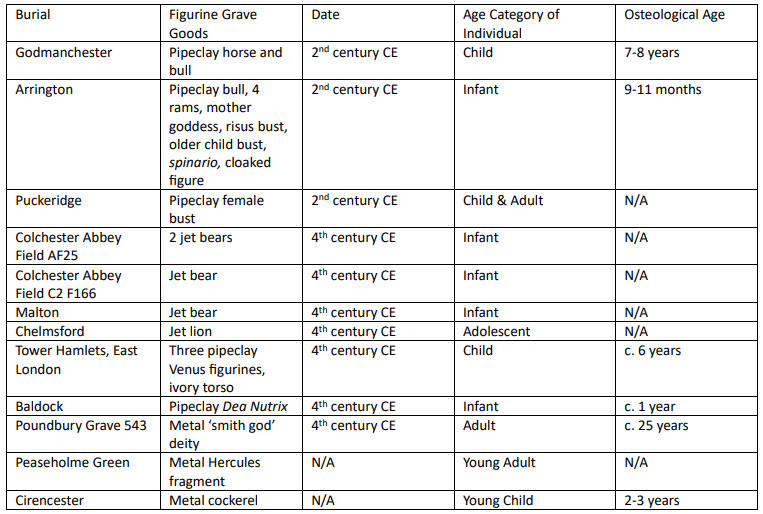 A table with data for the osteologically aged burials with figurine grave goods (Data from Crummy 2010, Durham 2012, Fittock 2017, Cotswold Archaeology 2019) © Esmé Goodson